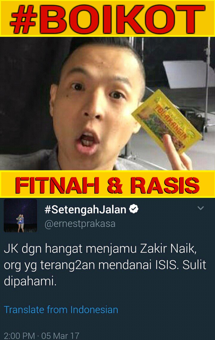 BANTENPERSPEKTIF.COM, JAKARTA---Tolak Angin sepertinya akan menanggung risiko akibat bintang iklan yang dipakai endorser, yaitu Ernest Prakarsa membuat ulang dengan menuding kalau Zakir, seorang ulama sebagai penyandang dana ISIS. Netizen pun ramai-ramai memboikot Tolak Angin.